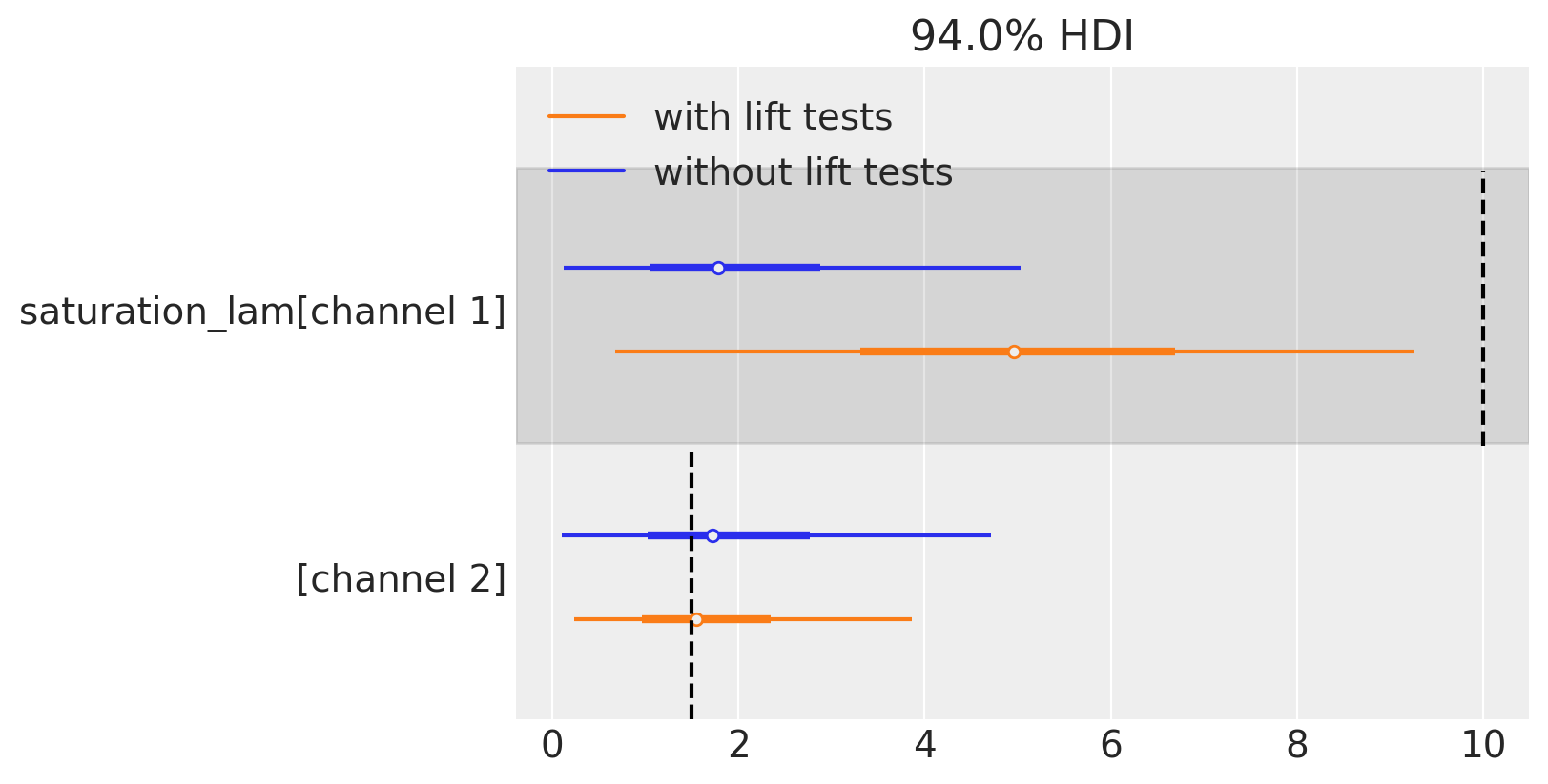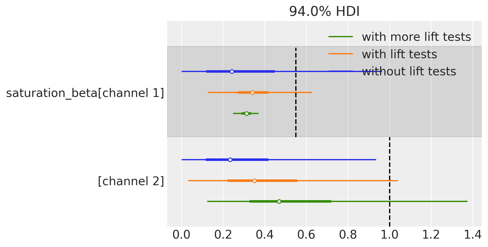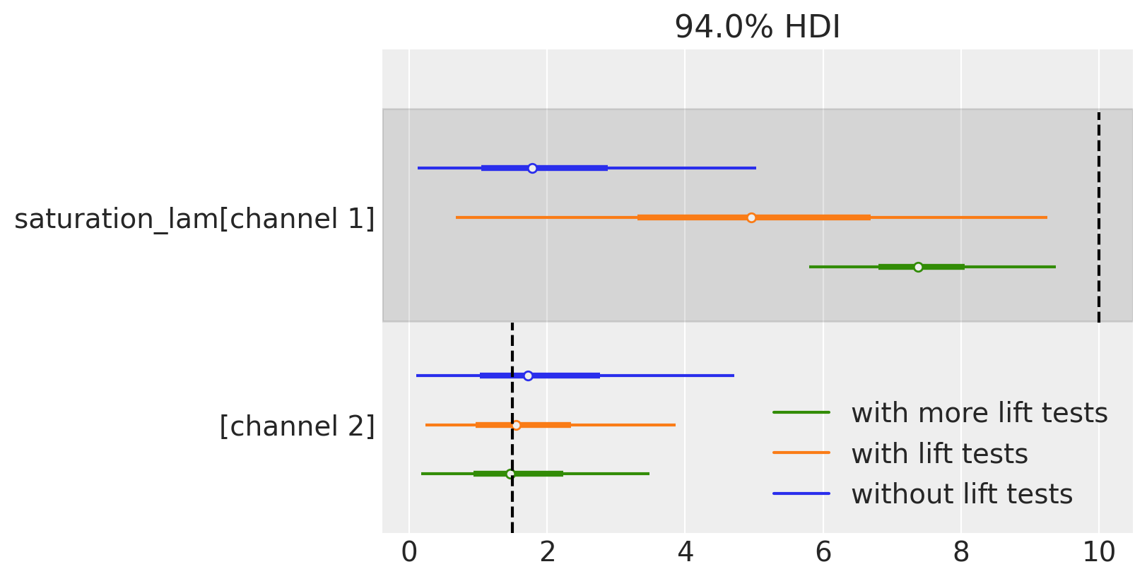 model_names = ["without lift tests", "with lift tests", "with more lift tests"]