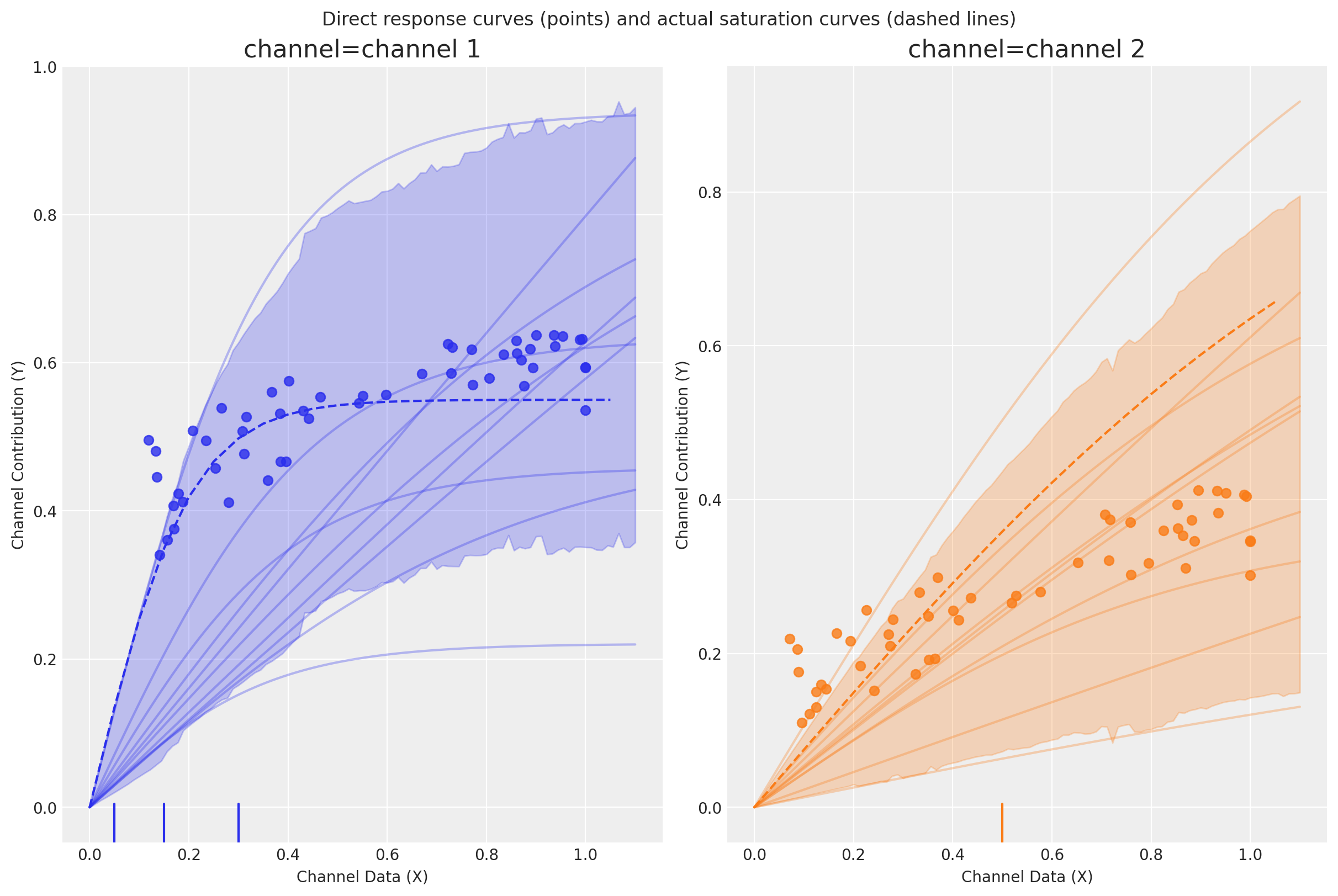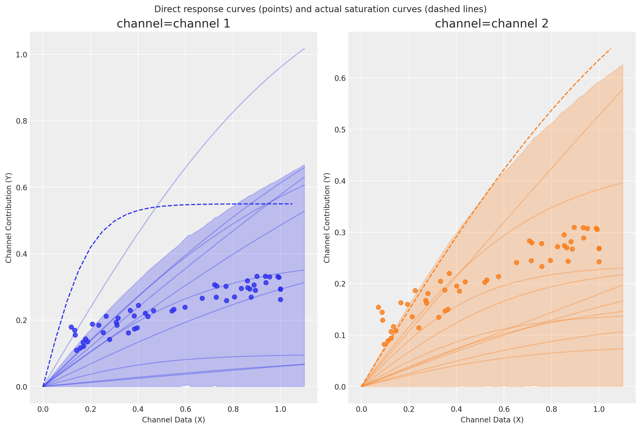 We can also witness that while the actual saturation curves are different (because we specified the true parameters for each channel), the MMM is unable to distinguish between the two channels.
