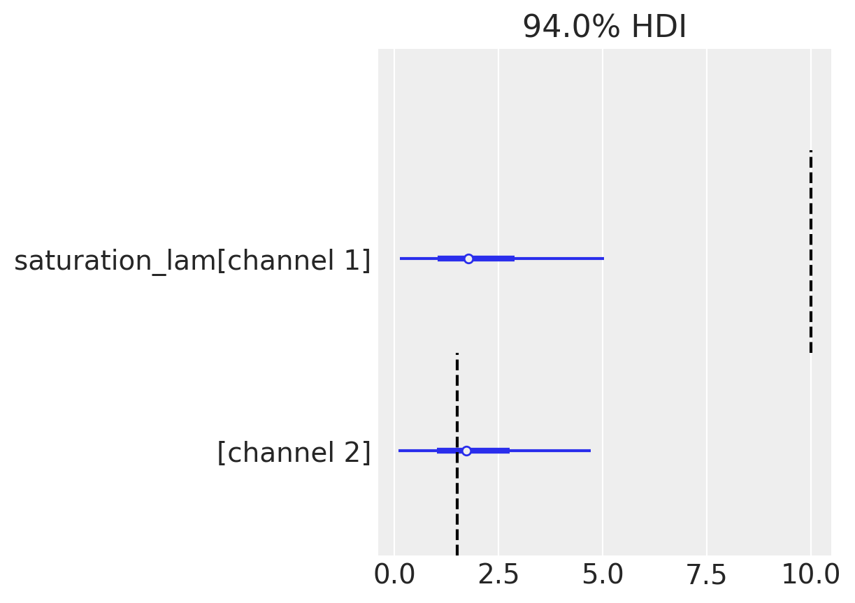 In order to avoid confusion with the plot above, the actual saturation curves are represented by the dashed lines, while the direct contribution curves are represented by the points. If lift tests can help us in this situation of high spend correlation, then we should be able to detect this by: a) achieving better parameter estimates, and b) correspondingly, getting better estimates of the saturation curves.