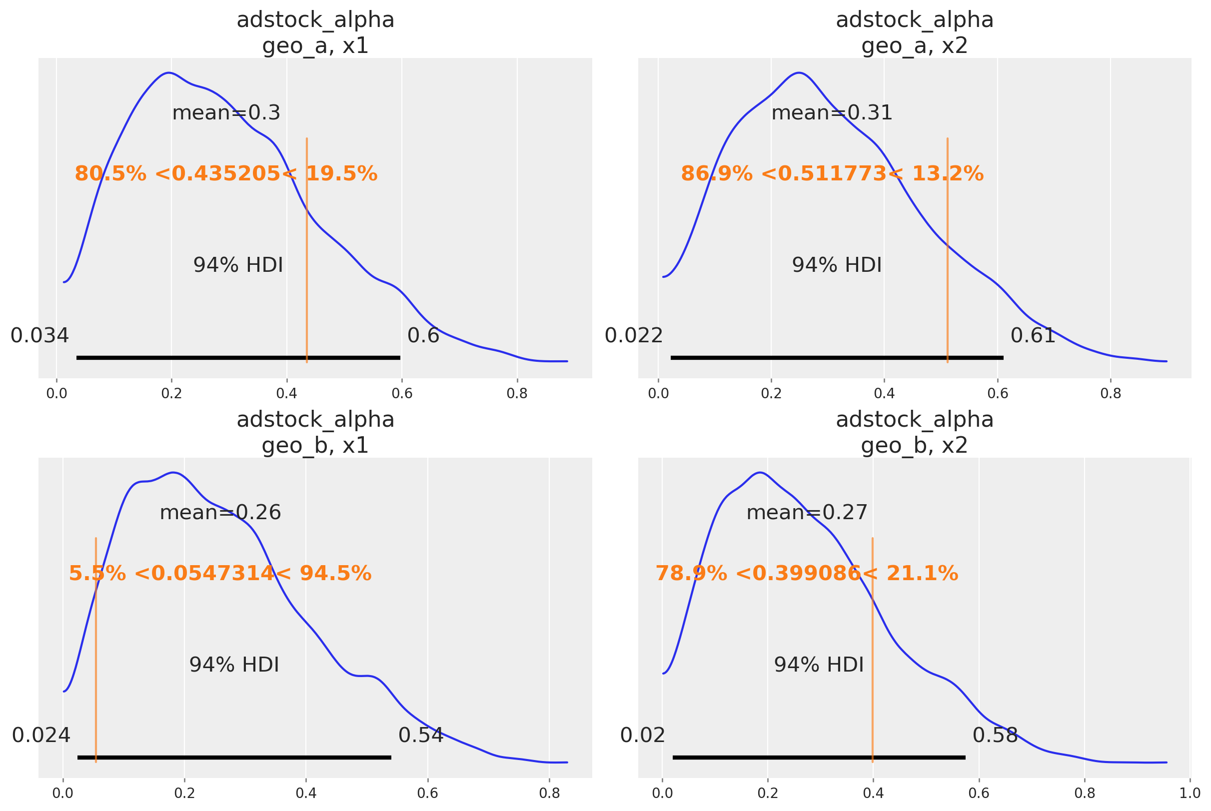 This notebook is only illustrative so we’ll show you how to code each type of assumption you might make (we aren’t recommending a universal solution!). Lambda represents the efficiency of a channel. The higher the lambda, the more responsive sales are to spending on that channel. We’ll have the lambda parameter be fully pooled across all geographies. We are assuming that channel 1 has the same efficiency in both geos, so we do not specify “geo” dims. The package will automatically broadcast the channel effect for each geography.