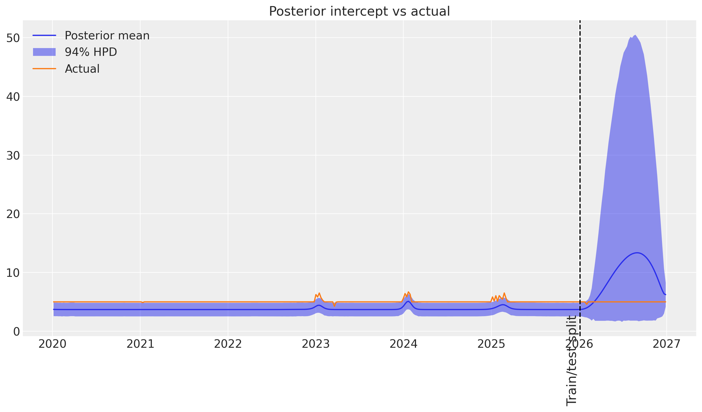 We conclude that while the GP-based time-varying intercept can technically do the job for seasonality and trends, it’s not the most efficient way to do so (choose a Fourier basis or linear trend instead). However, to capture unexpected events that no other variable can explain, it’s very powerful 💪.